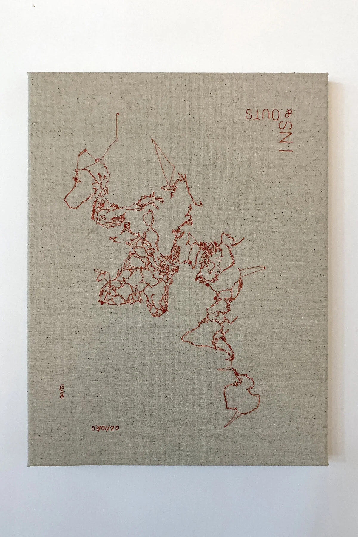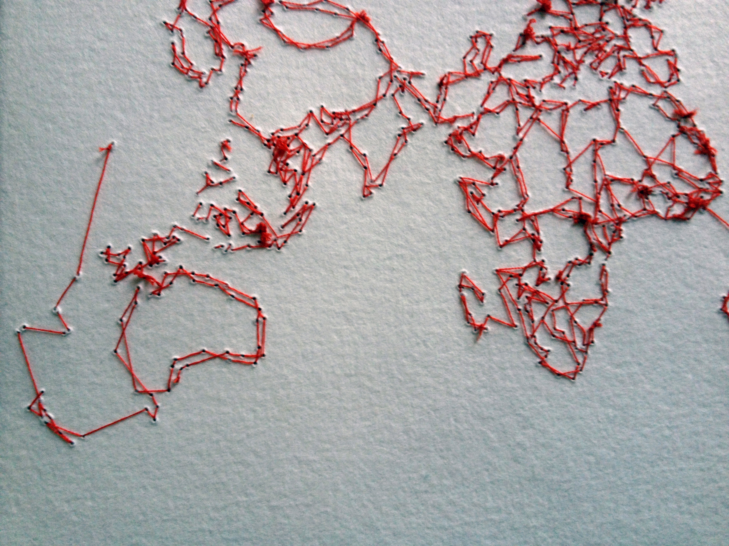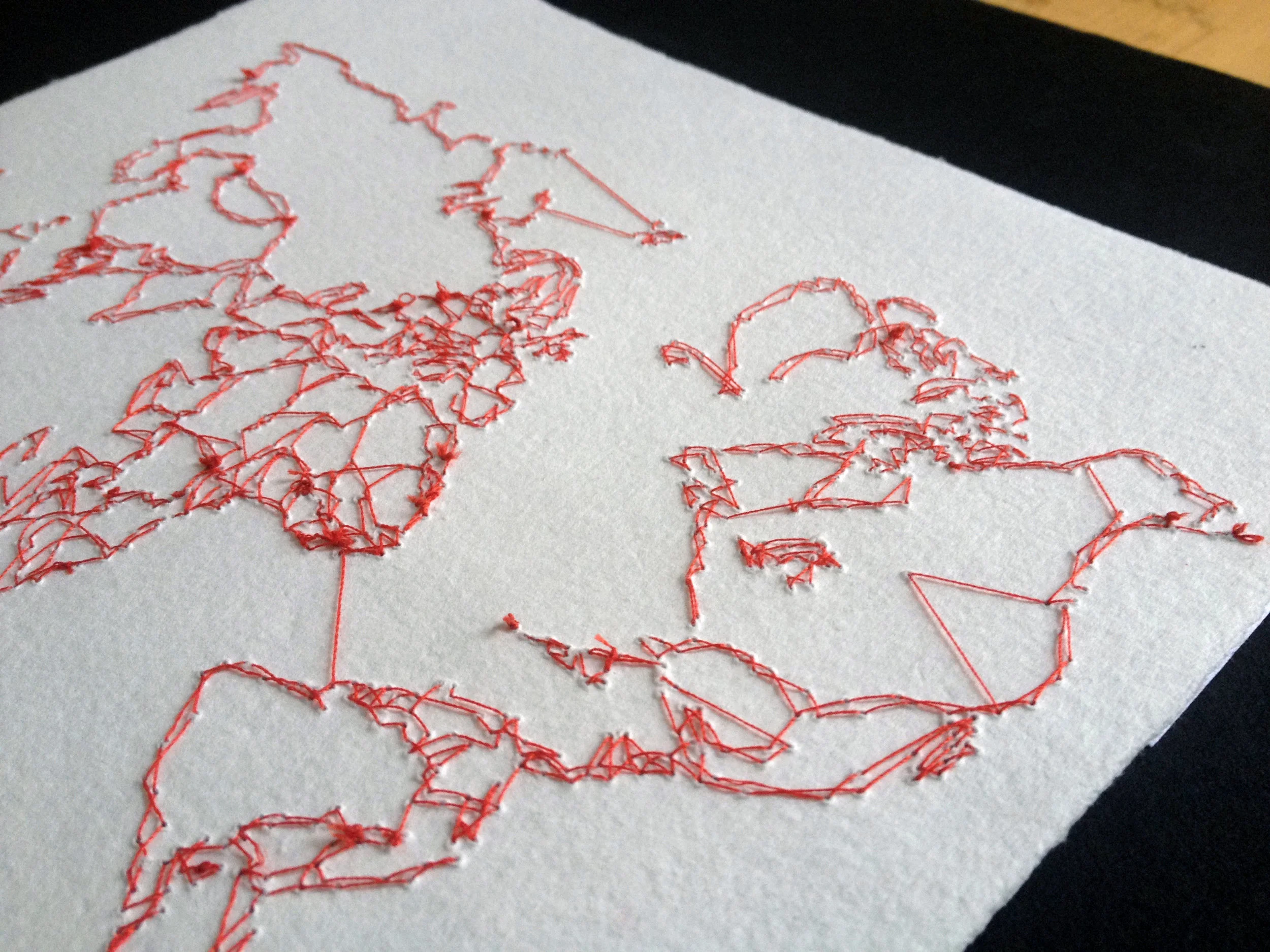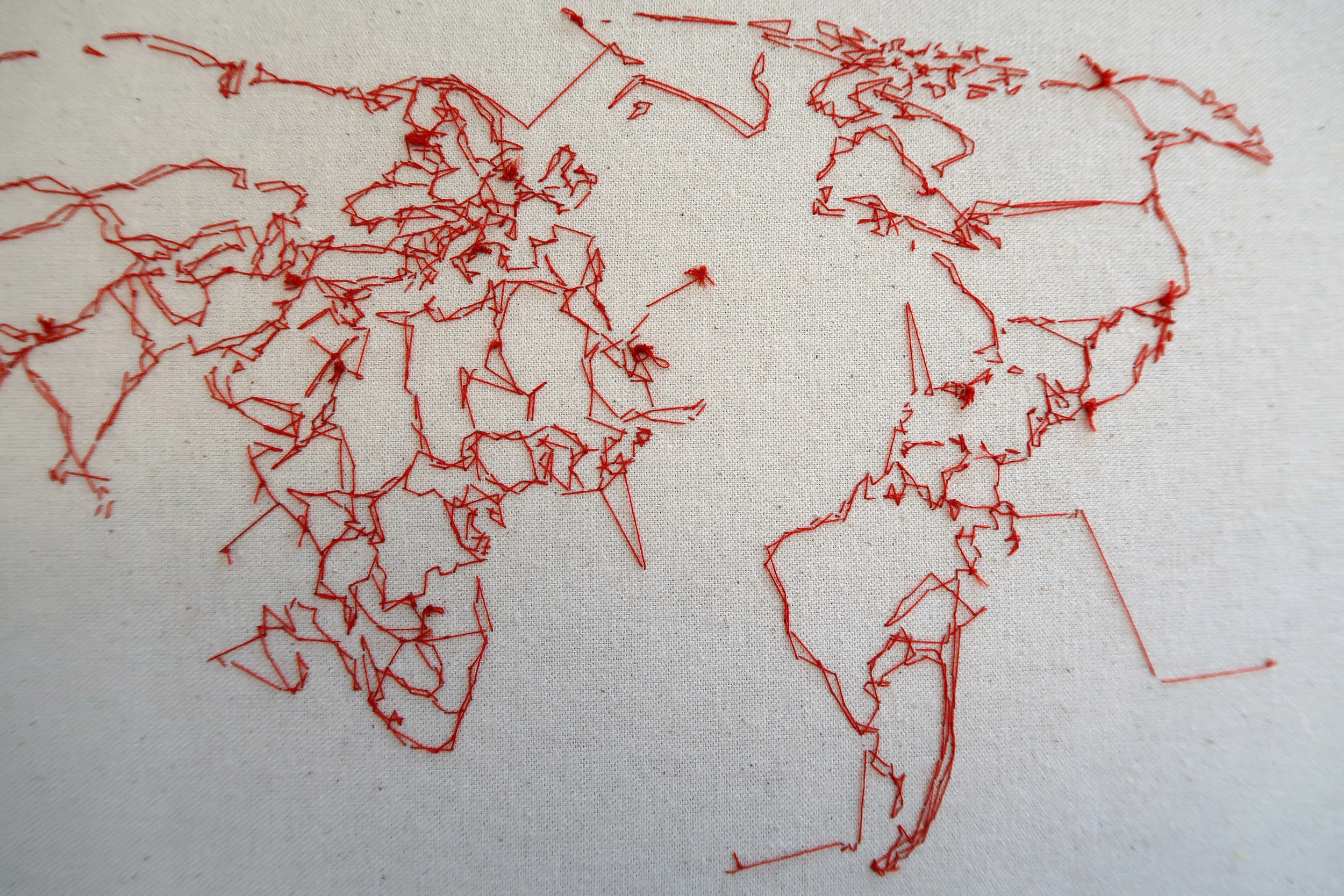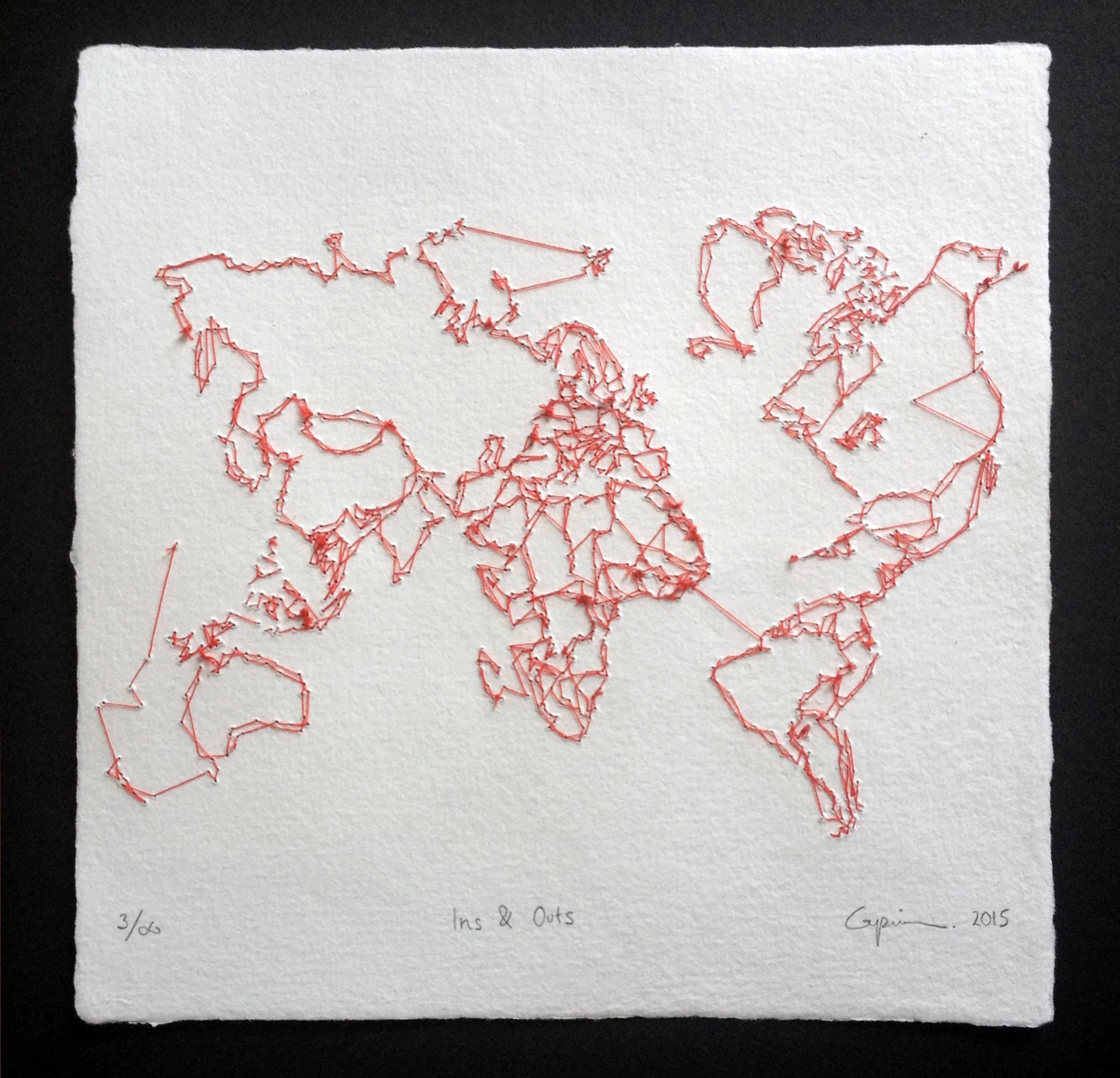 Ins & Outs is a series of hand-stitched world maps, flipped around to reveal the knots and ties of the embroidery process, rather than the classic geographical borders we are familiar with. This gesture symbolizes the hidden and “ugly” side of geopolitics. It playfully draws new relationships between places that are, in any case, arbitrarily divided by a few players in history who have had the power to pull the strings. Numbered out of infinity, these variations also represent the infinite number of ways one can view, represent, and therefore interact with the world.