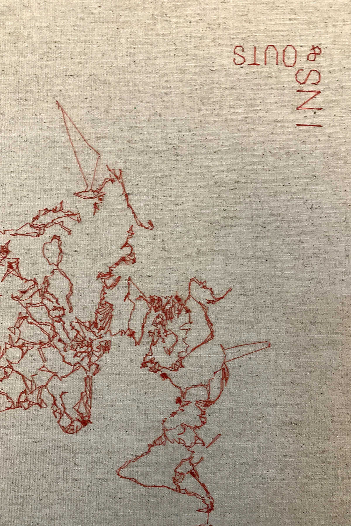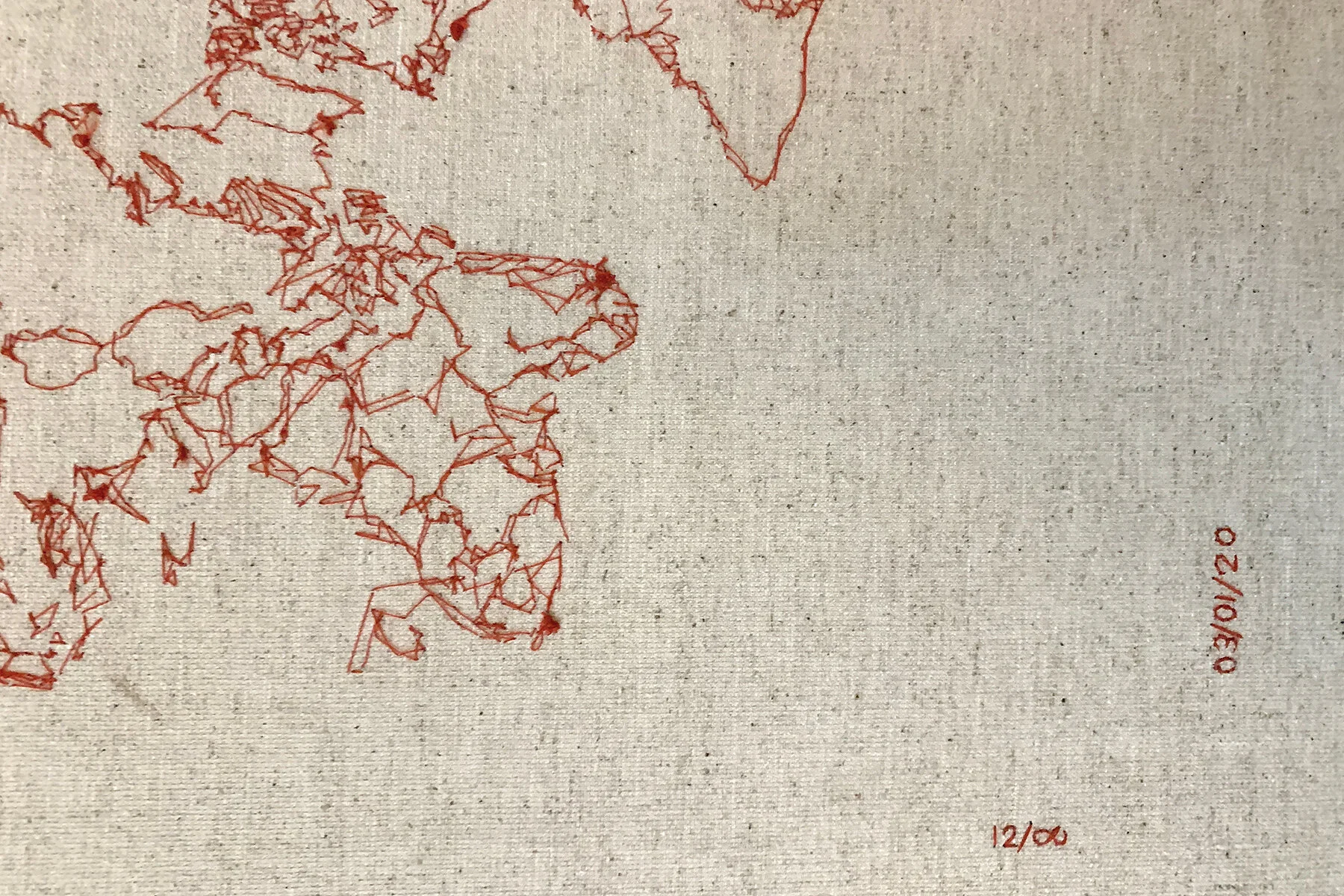 Hand-stitched thread on hand-made paper, found fabric or canvas, dimensions variable