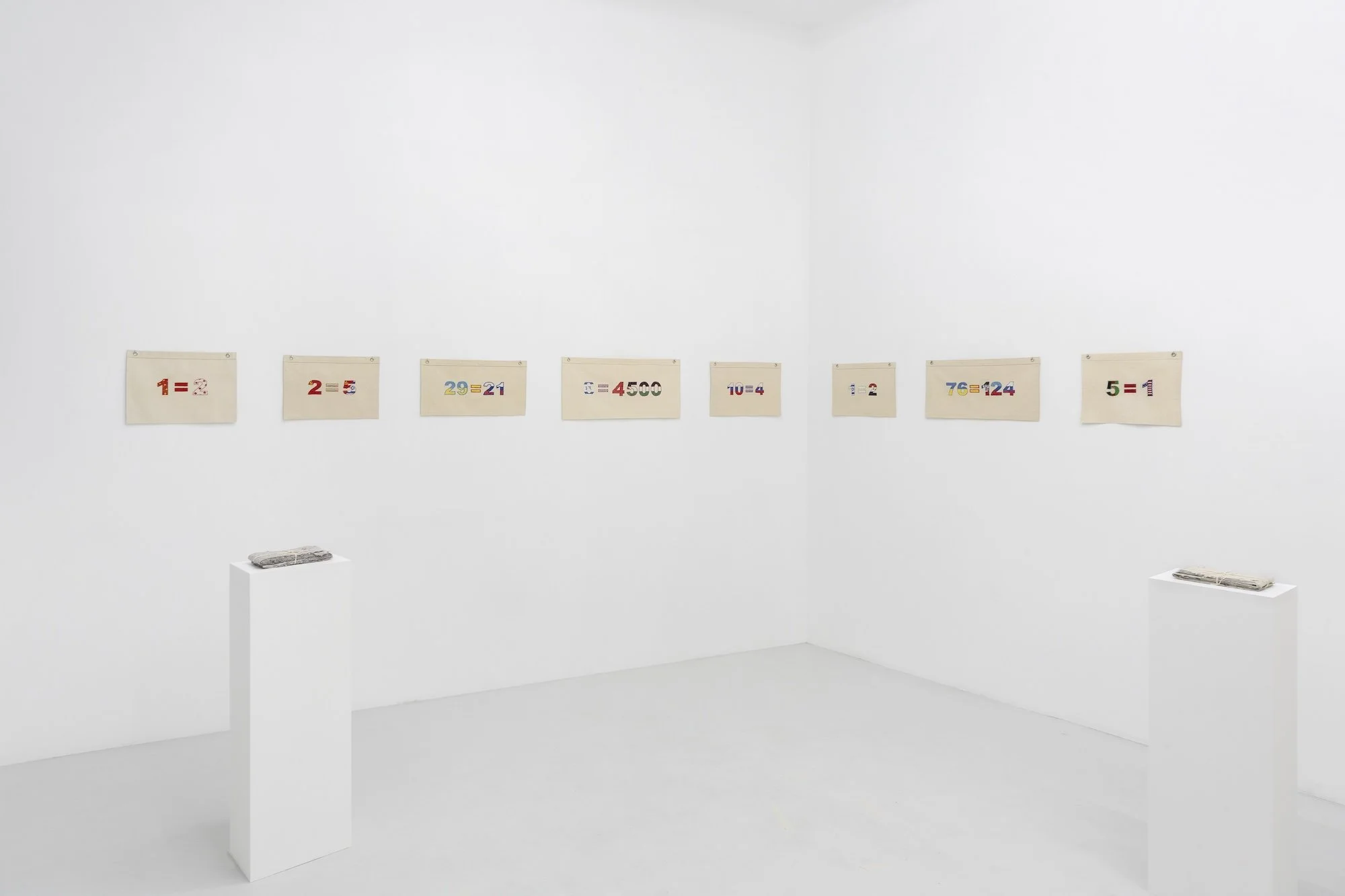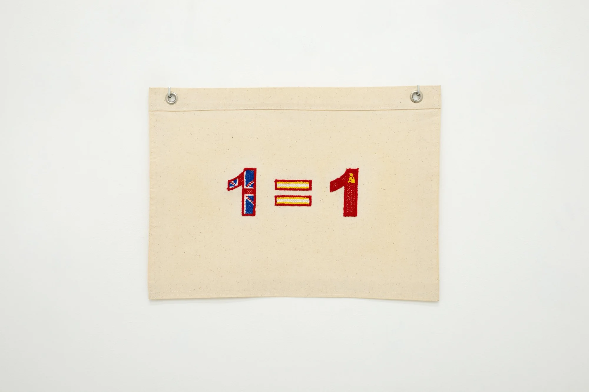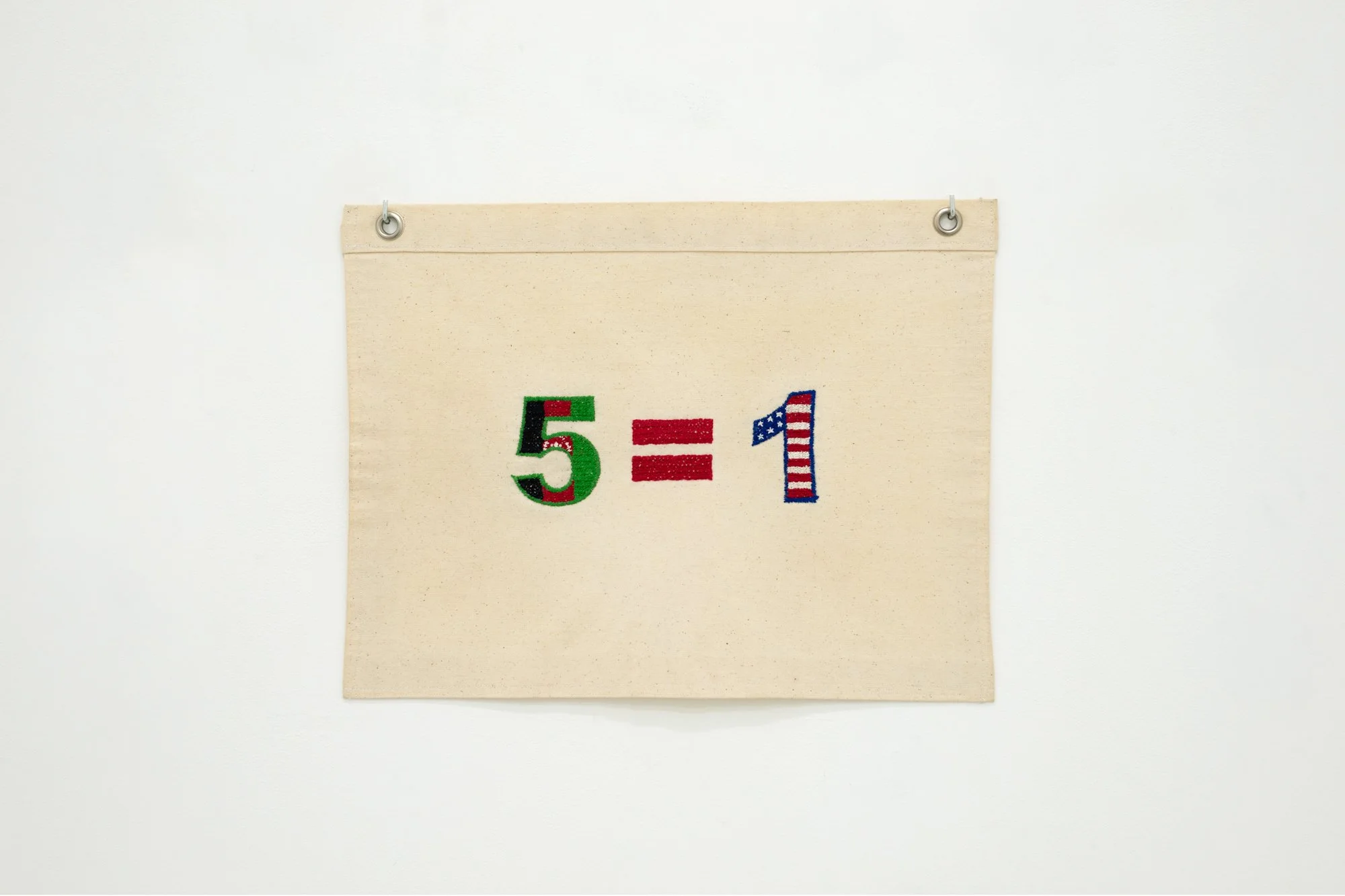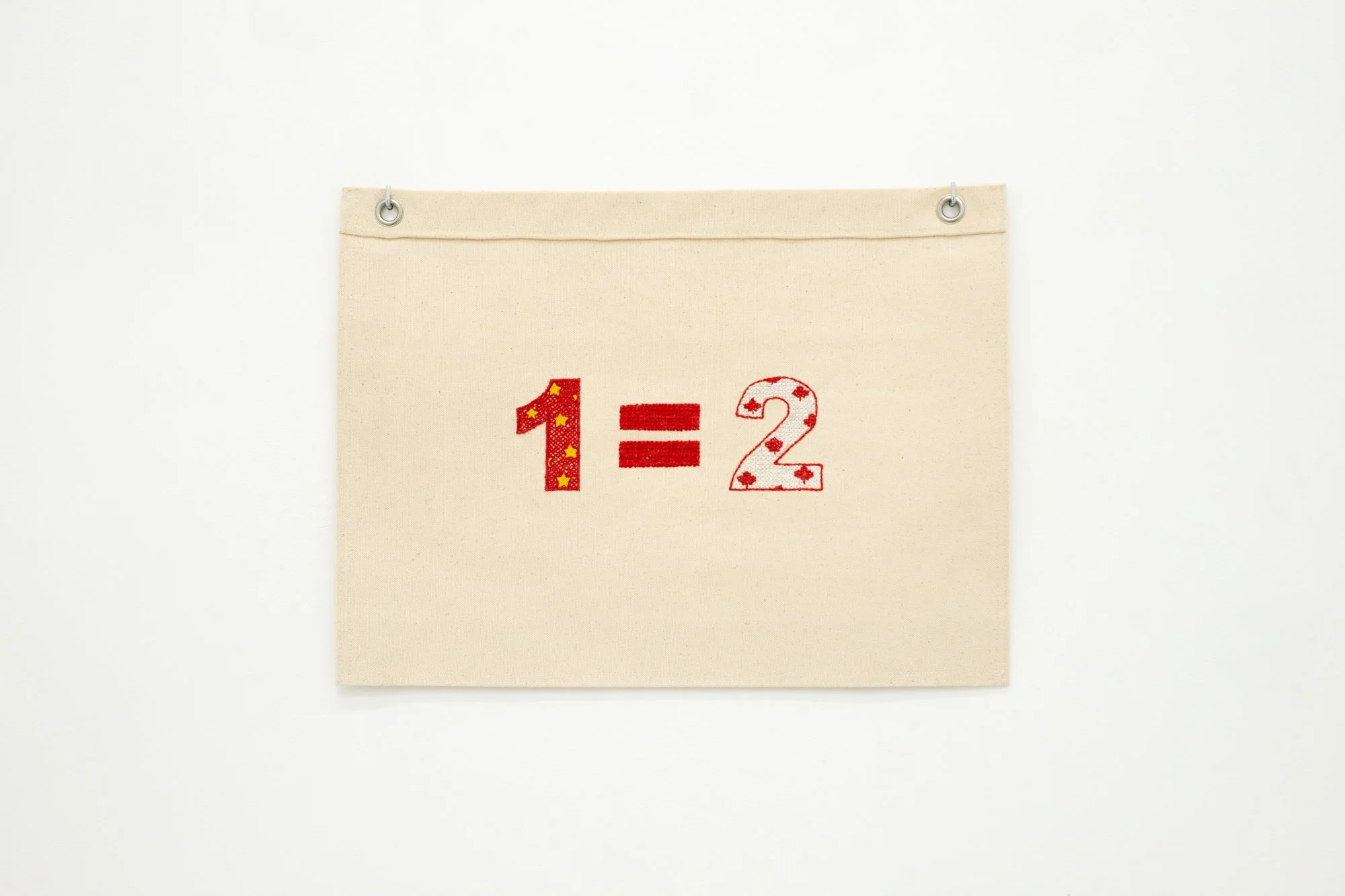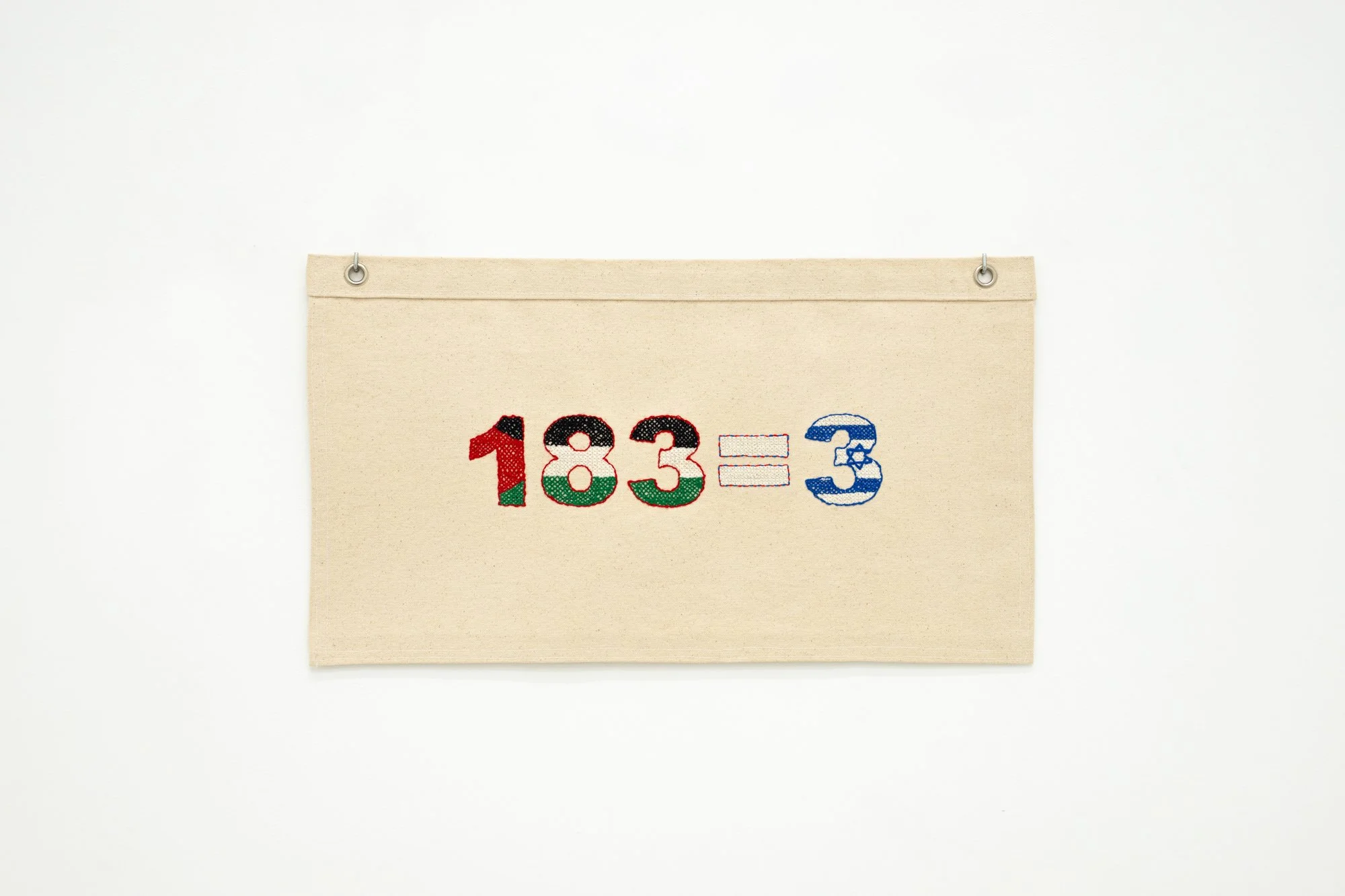 Universal Values tallies real-life geopolitical equations—prisoner exchanges—by embroidering canvas flags. Rarely arithmetically correct, the absurdity of these (in)equations reflects the impossibility of equating one life for another, while also revealing the very facts proving how often nations still resort to this impossible math. Contrary to its sister project White Flags, which partially conceals the nationalities of the individuals involved in each swap, Universal Values embeds national patterns into each equation. A domestic and cross-nationally familiar manual technique, cross-stitch is a binary process that echoes the dual nature of an equation, the polarization of international relations, the increasing pressure to pick sides on geopolitical issues, the pixelization of complexity, the disappearance of nuance, the positive and negative, the front and back.